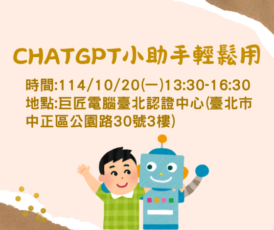 上課時間:114/10/20(一)13:30-16:30地點:巨匠電腦臺北認證中心(臺北市中正區公園路30號3樓)上課班別:銀髮族專班報名資格:60歲(含)以上免付費報名專線:0800-088-258專線服務時間:周一至周五9:00-12:00、13:00-18:00(不含假日)上課費用:免費開班人數:依實際上課場地,額滿為止開課單位:巨匠電腦開課内容:1.用ChatGPT幫忙大小事2.安全使用ChatGPT3.識別假冒ChatGPT歡迎60歲以上銀髮族來電報名〜